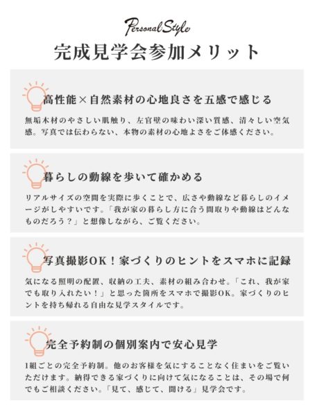 ぜひ見学会で、高性能 ✕ 自然素材の心地よさをご体感ください。