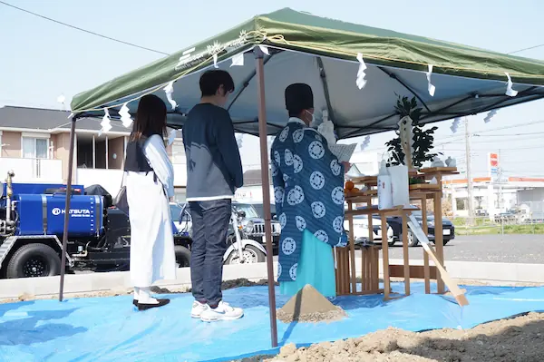 工事の安全を祈願する地鎮祭を行い、基礎工事を開始。建物の耐久性を支える重要な工程で、しっかりとした土台を築きます。